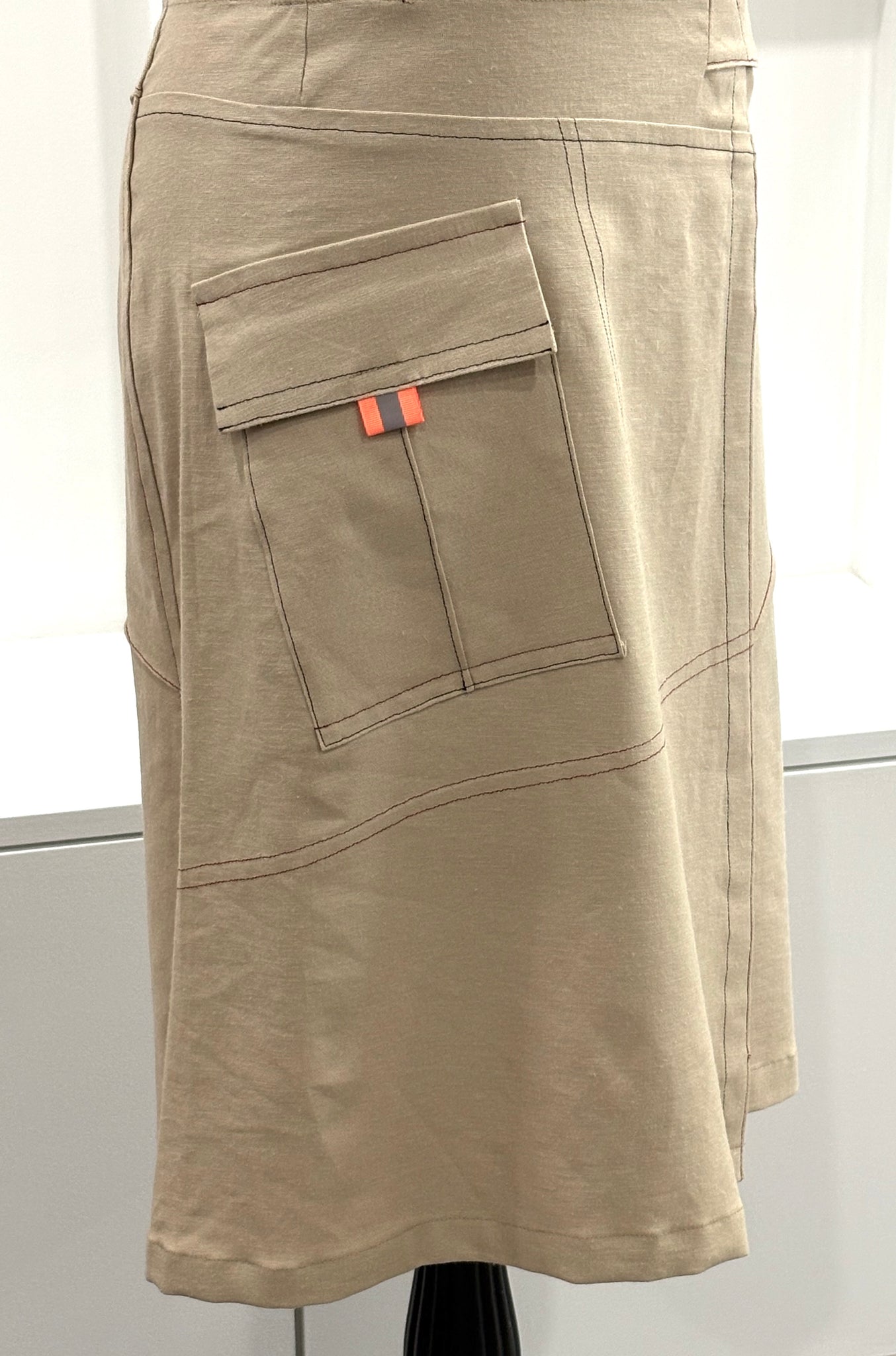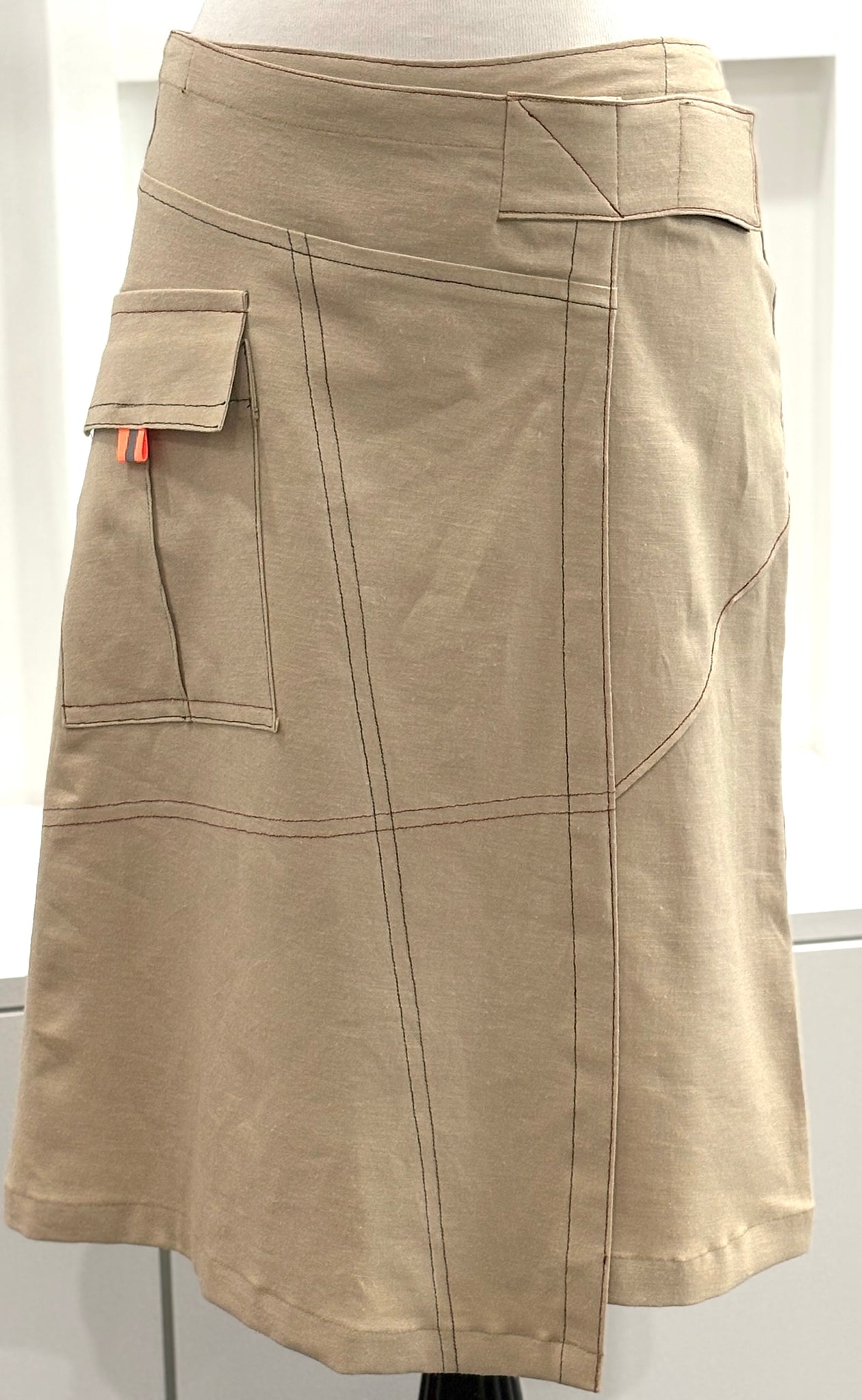This wrap skirt with velcro closure is a tan colour stretch linen that is substantial enough for even winter weather. It has a front patch pocket with a flap, and top-stitched details in black and red. Pairs easily with a black, cream or red over-sized sweater long or short or with something more fitted. Either way the skirt has a very flattering forgiving fit with structure and a bit of give from the spandex.