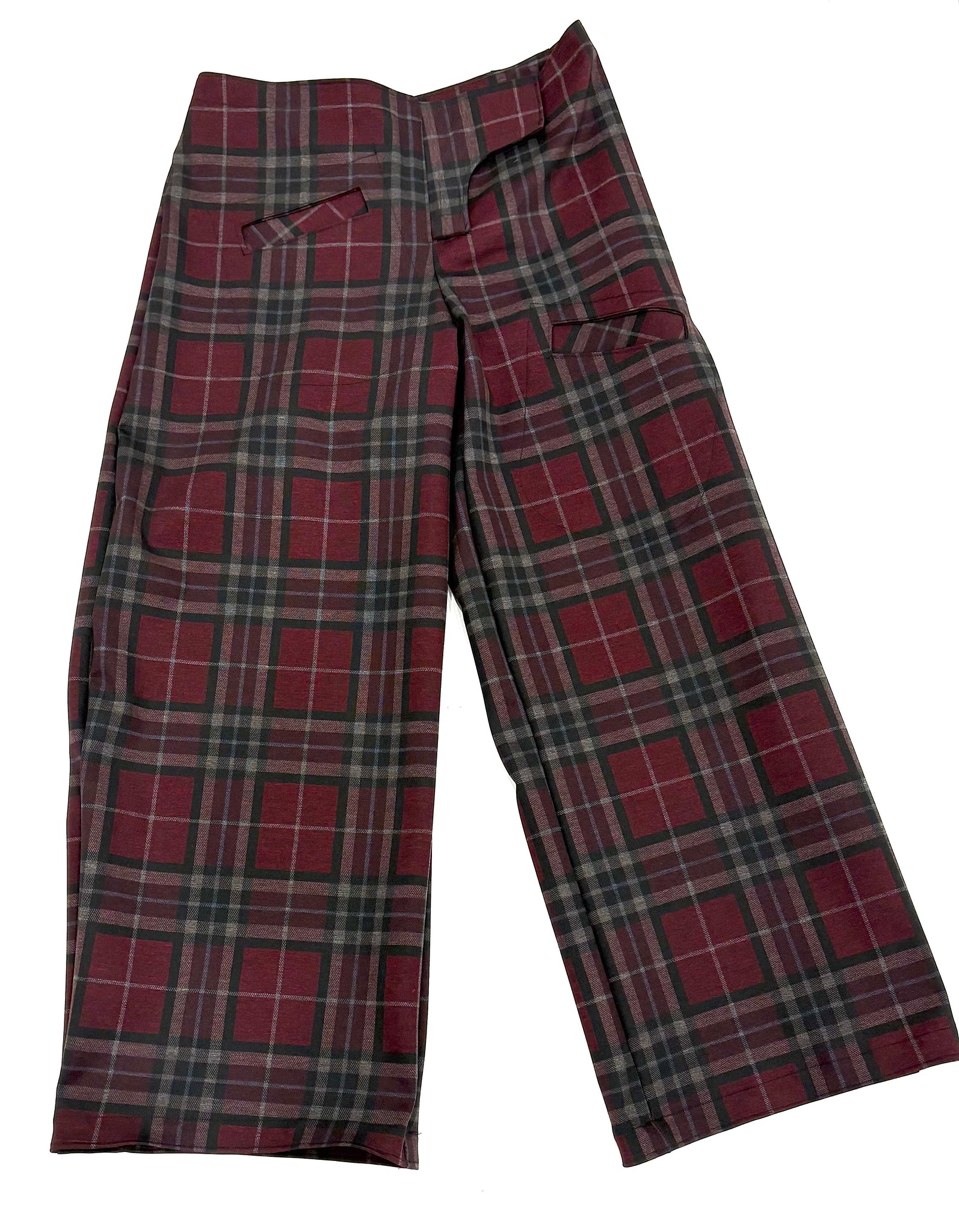 These slightly cropped plaid pants have an inseam of 27inches which may be full length for some. They are super flattering and definitely comfortable. 2 welt pockets at front and 2 pockets at back. Velcro front closure. The fabric is the all time favoured ponte, which is a blend of poly, rayon, spandex. The fit is comfortable on the body as it has structure and spandex with a loose fit in the legs, a pleat at the hem outer seam gives a beautiful look.